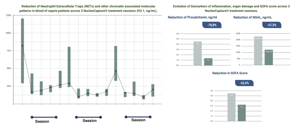 NucleoCapture® treatment stabilized and improved outcomes for critically ill patients who otherwise were expected to die rapidly. This was associated with reduction in NETs, inflammatory markers, organ damage, and decreased need for vasopressors and organ support. Across more than 40 treatment sessions performed, NucleoCapture® was well tolerated with no adverse events. It was safe and easy to use NucleoCapture® in the ICU environment.